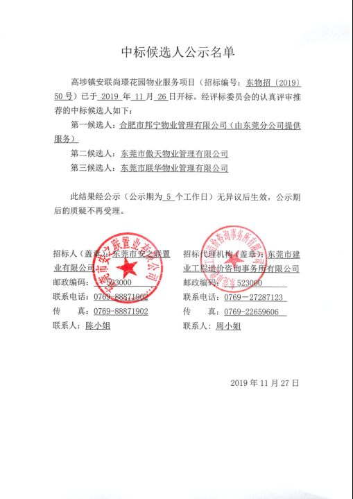 高埗鎮安聯(lián)尚璟花園物業(yè)服務(wù)項目中標候選人公示名單