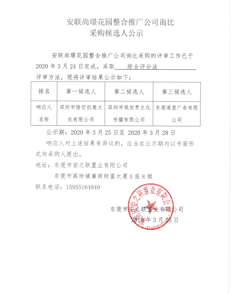 安聯(lián)尚璟花園整合推廣公司詢(xún)比采購候選人公示